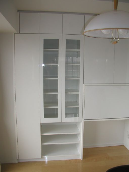 白鏡面仕上げで右側部分はパソコン机として使用します。