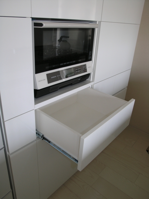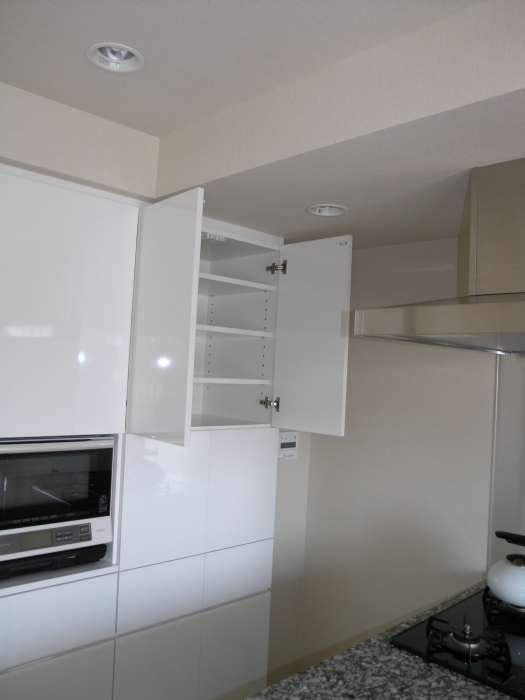白鏡面の食器棚。 冷蔵庫の扉に前面を合わせてスッキリしたキッチンになりました。 |