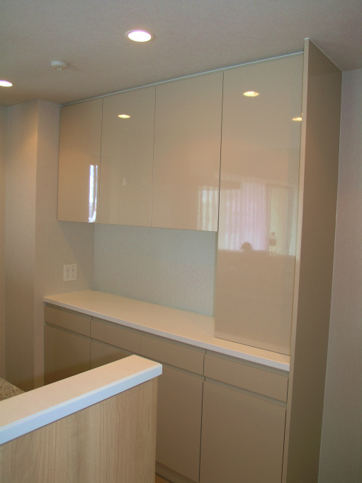 キッチンの面材に合わせてベージュ鏡面で仕上げました。