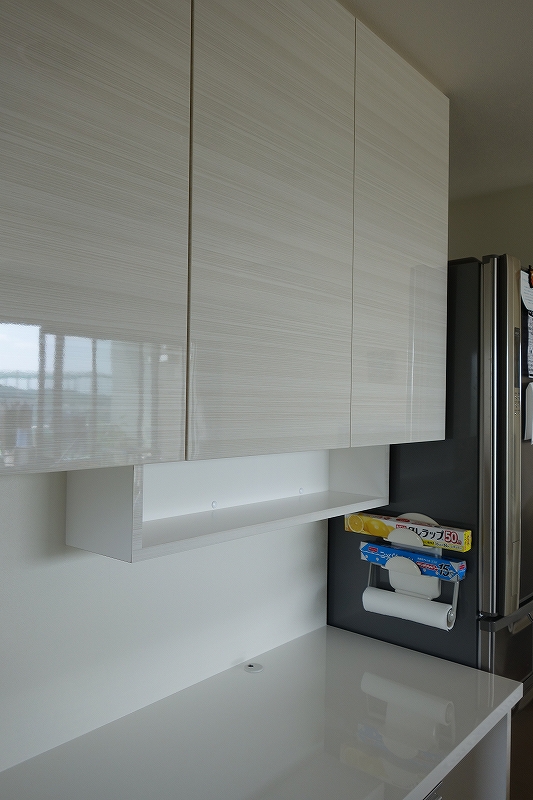綺麗な艶ありの木目です。吊戸棚の下場に小物が置ける棚を設置