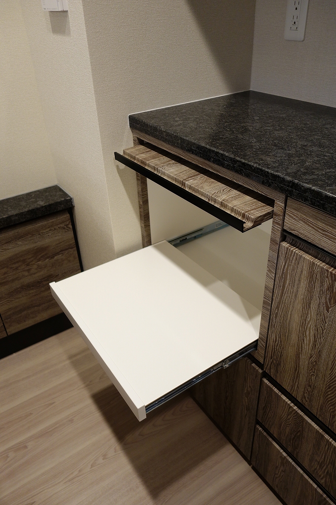 冷蔵庫上吊戸棚は上開き扉にしました。